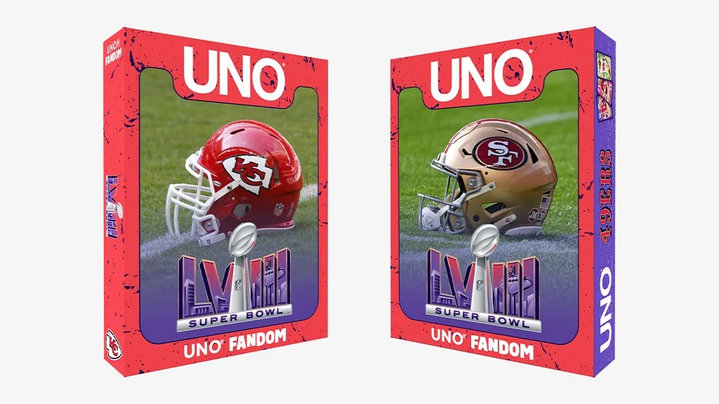Konečně, karetní hry UNO LVIII Super Bowl obsahují karty zobrazující hráče týmu a v každém balíčku je také sběratelská fóliová karta. Nové balíčky jsou součástí značky Mattel Creations UNO Fandom, která nabízí hry UNO pro sběratele, zdůrazňujíc zábavné značky, sportovní týmy a popkulturu.