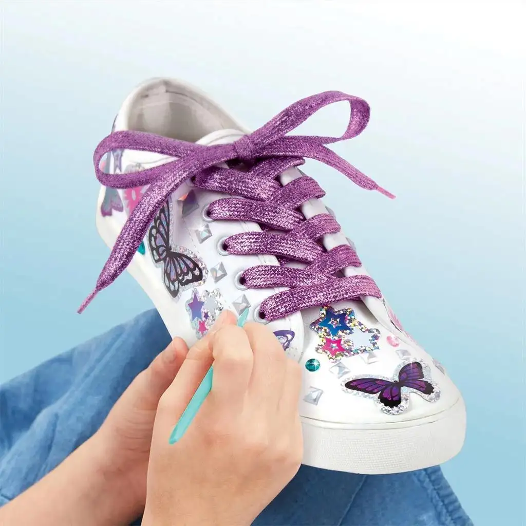 Vytvořte svůj vlastní módní trend, protože nyní můžete nosit své vlastní dekorované boty kdekoli. S pomocí Make It Real Sticker Chic můžete změnit vzhled svých bot. Začněte s bílou botou a oživte ji trendy vzory, barevnými tkaničkami a mnoha doplňky. Čerpejte inspiraci z motýlí sady Make It Real Sticker Chic a oživte své dny nejživějšími barvami a motivy. Je tu spousta šperků a motýlích nálepek, které mohou vaše boty zkrášlit a stát se atraktivnějšími, dokonce i vaše tkaničky mohou zářit krásnou fialovou barvou.