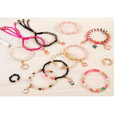 Pro vaši malou dceru můžete pořídit speciální sadu, která se jí určitě zalíbí a umožní jí nejen mít vlastní šperky, ale také vyzkoušet její kreativitu. Sada obsahuje různé základy pro náramky, řetízky a nitě, které lze kombinovat s korálky a přívěsky a vytvořit tak originální kousky. Sada je zdůrazněna zlatými a růžovými tóny, takže je velmi dívčí a hodí se téměř ke všemu. Hotové náramky může darovat svým kamarádkám jako přátelské náramky.
