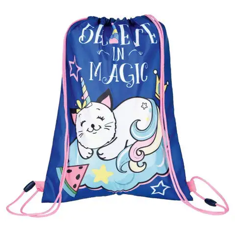Přinesli jsme pro tvé dítě speciální cvičební tašku, která se mu určitě bude líbit, protože na ní je roztomilý spící kočičí jednorožec. Taška je vyrobena z materiálů vynikající kvality, díky čemuž bude dlouho v provozu, ať už do školy nebo na tréninky. Tvá dcerka ji může nosit i jako batoh, protože má dvě šňůrky, které slouží k zavírání a otevírání, a zároveň fungují jako popruhy. Pořiď své dceři tuto tašku a hledej i další školní potřeby s motivem kočičího jednorožce.