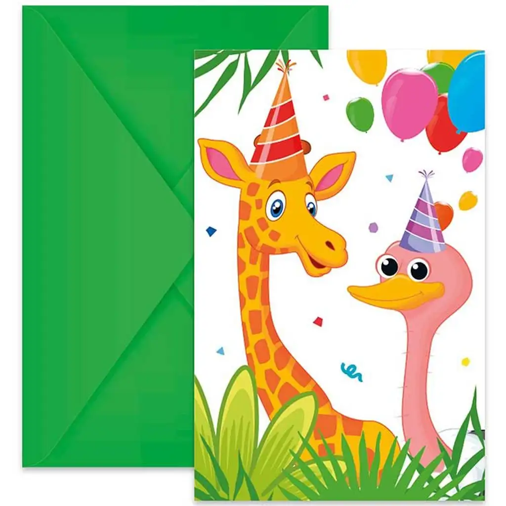 Oživte přípravy na narozeninovou oslavu s touto roztomilou sadou pozvánek s motivem džungle, díky které se každý malý host bude těšit na dobrodružství už od chvíle, kdy obdrží pozvánku! Balení obsahuje 6 pozvánek s veselou grafikou, na kterých přivítá pozvané přátelská žirafa a usměvavý pštros ve společnosti barevných balónků a party čepic.