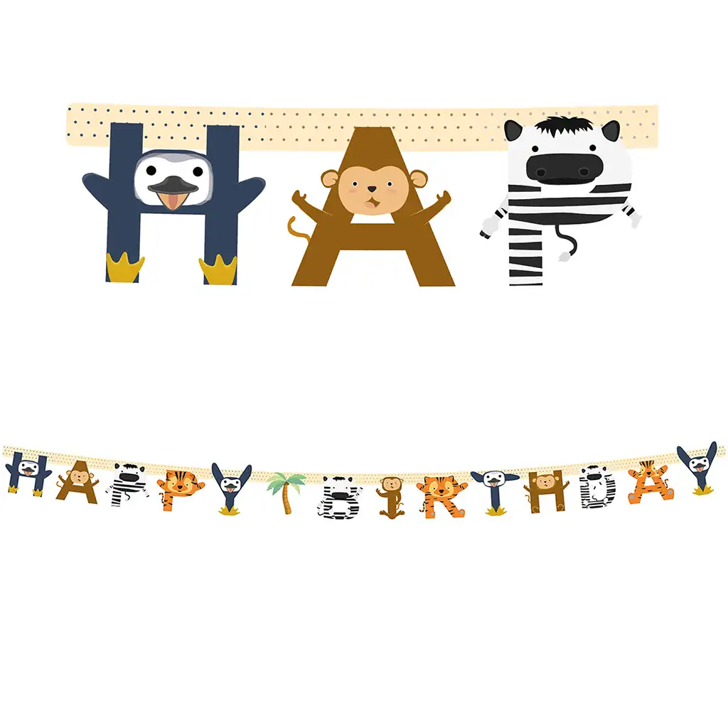 Tento veselý a barevný narozeninový banner s motivem zvířat je ideální volbou, pokud chcete mít veselou atmosféru s tématem zvířat na narozeninové oslavě! Nápis "Happy Birthday" je zdoben roztomilými džunglovými a savanovými zvířaty – včetně tučňáka, opice, zebry, tygra a mnoha dalších přátelských postaviček, které si děti určitě zamilují.
