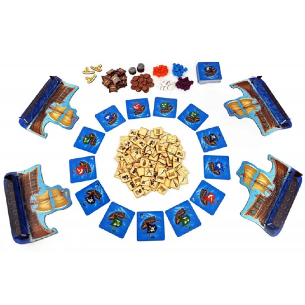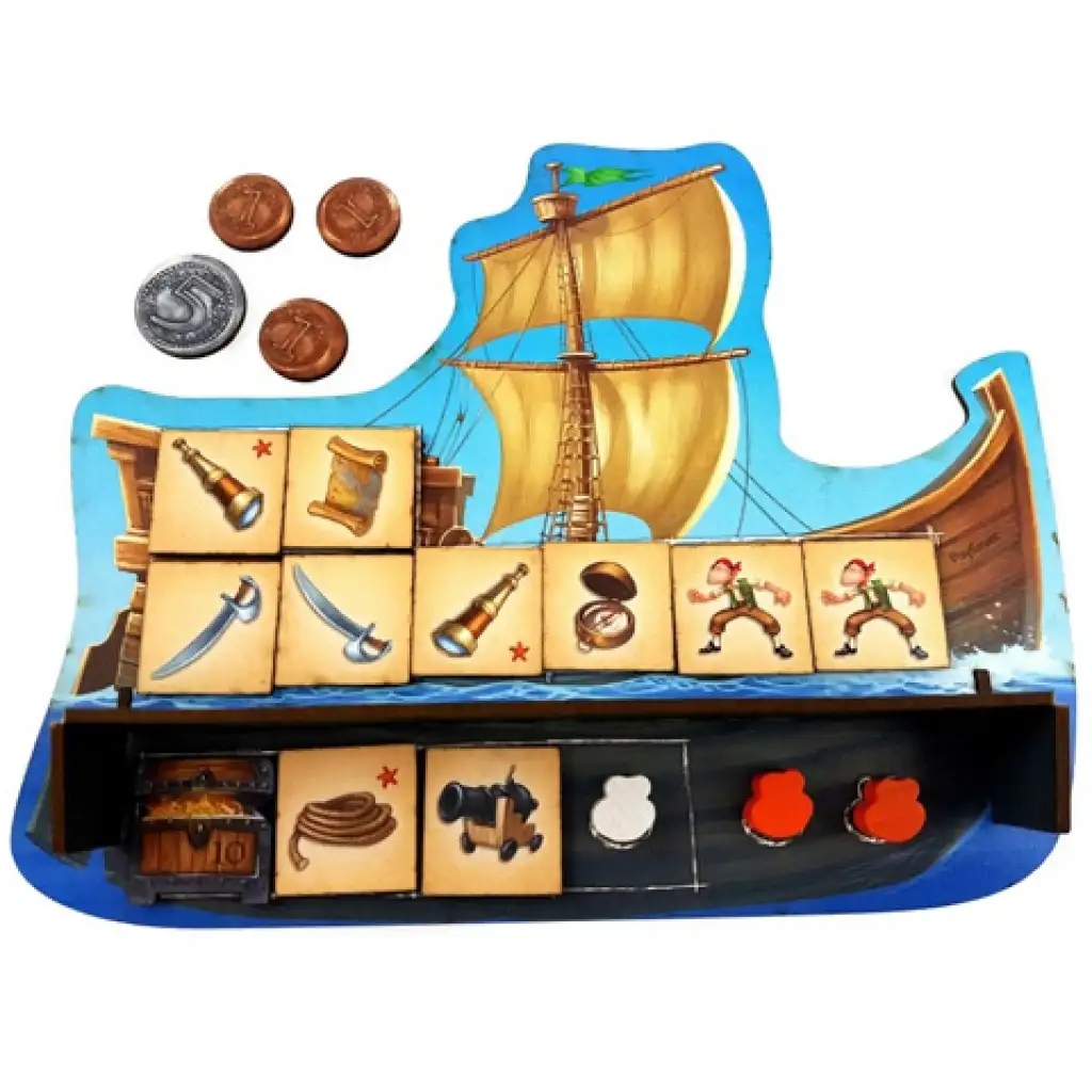 Musíte co nejrychleji naložit nákladní prostor lodi, protože brzy budete muset vyplout na dobrodružství a ostatní piráti se také připravují, aby vás předběhli, ať už v boji nebo v obchodování. Hra Alles an Bord se skládá ze dvou samostatných částí. V první části musíte soutěžit s ostatními a rychle sbírat náklad ze středu, abyste ve druhé fázi, během dobrodružství, měli dostatek a samozřejmě vhodný náklad nashromážděný v útrobách lodi, který můžete použít k objevování nebo je vyměnit. Pokud to bude nutné, můžete bojovat a uzavírat smlouvy s protivníky, ale srdce pirátů vždy bije pro to samé, a to je získání nesmírného bohatství a pokladů.