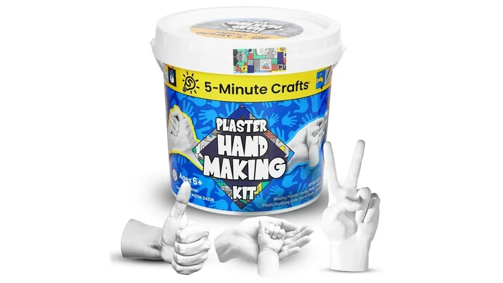 5minutová sada pro výrobu sádrové ruky řemeslníka může vyvolat vážný smích nebo dojemné okamžiky. Sada obsahuje všechny potřebné nástroje pro vytvoření památek vytesaných do kamene, jako je tvarovací prášek, litinová směs, brusný papír, sochařský nůž, rukavice a mnoho dalšího.