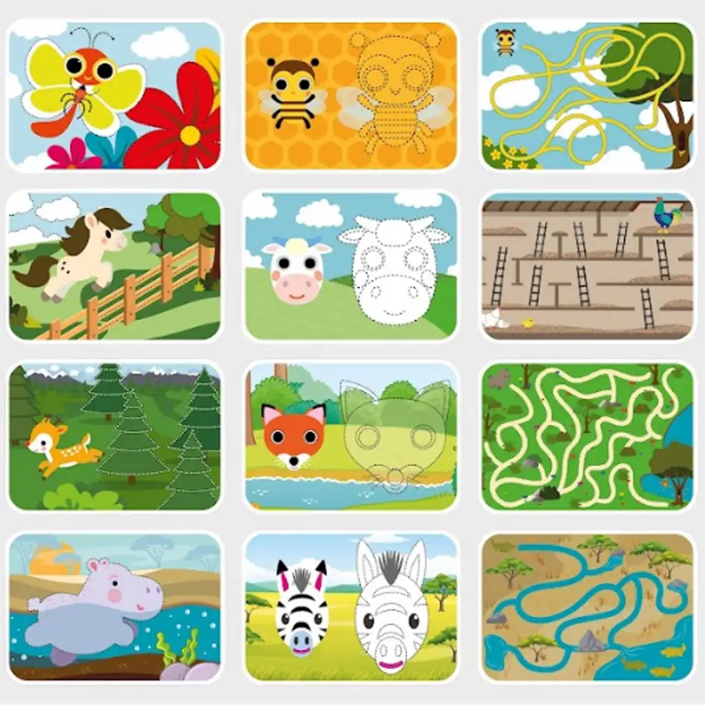 Vývojové úkolové karty s mazatelným fixem – Zvířata jsou vynikajícím nástrojem pro to, aby se vaše dítě hravě seznámilo se zvířaty, zatímco se rozvíjí jemná motorika, pozorovací schopnosti a logické myšlení. Barevné, veselé obrázky a rozmanité úkoly zaručeně upoutají pozornost malých dětí a pomohou jim, aby bylo učení pro ně zážitkem.