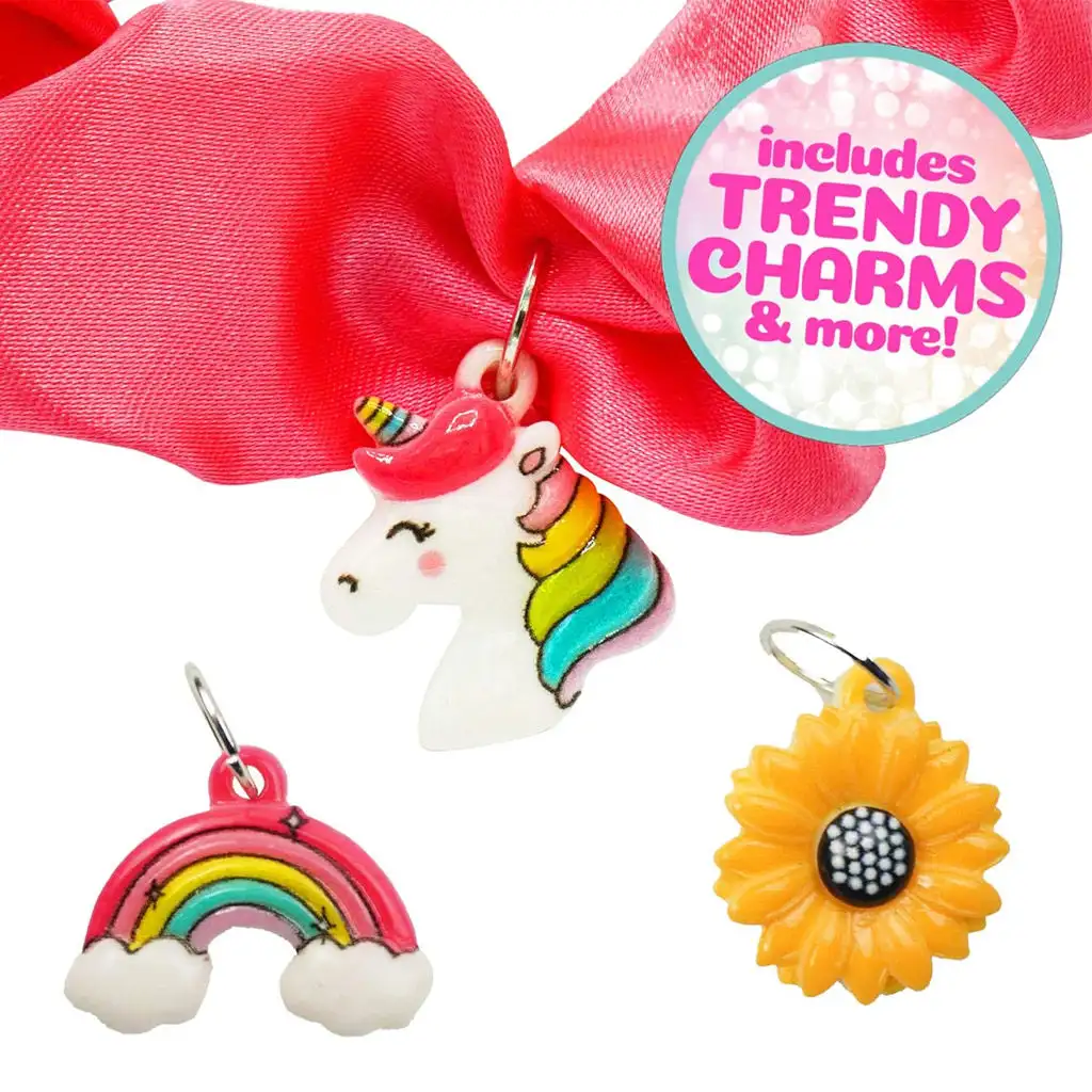 Tato sada DIY je skvělou příležitostí pro rozvoj a uplatnění kreativity dětí, protože mohou vytvářet módní doplňky. Sada je určena speciálně pro výrobu gumiček do vlasů, takže obsahuje spoustu saténových pásek vedle gumiček, které tvoří základ gumičky do vlasů.