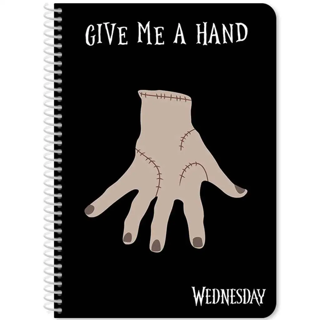 Okořeňte školní poznámky se spirálovým sešitem Wednesday! Tento 60stránkový sešit o rozměrech 17x25 cm přichází ve dvou úchvatných designech, které jistě zaujmou vaše dítě. Jeden z designů zobrazuje ikonický vzhled slavné Wednesday Addamsové, jak pózuje v černobílém oblečení s šálkem čaje, vedle ní je slavná postava ruky, Thing. Druhý design nese nápis „Give Me a Hand“ a postavu Thinga, což sešitu dodává jedinečný a zábavný vzhled.