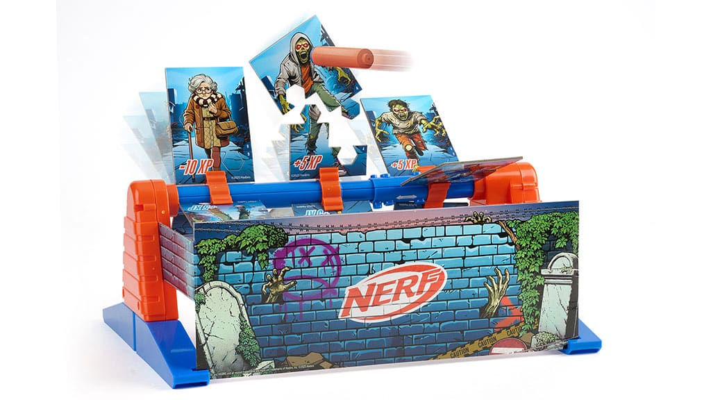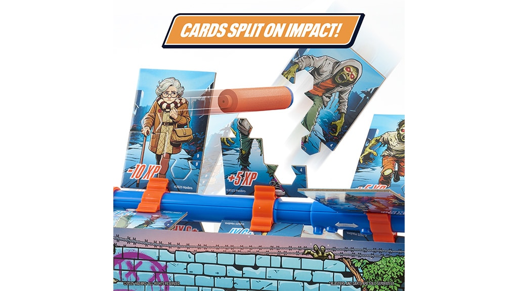 Poté musí pomocí NERF střel a vystřelovačů zasáhnout Zombie karty na otočném rámu, které se při zásahu snadno rozpadnou. Hra je tak jednoduchá, body lze rychle sledovat a je snadné začít znovu.