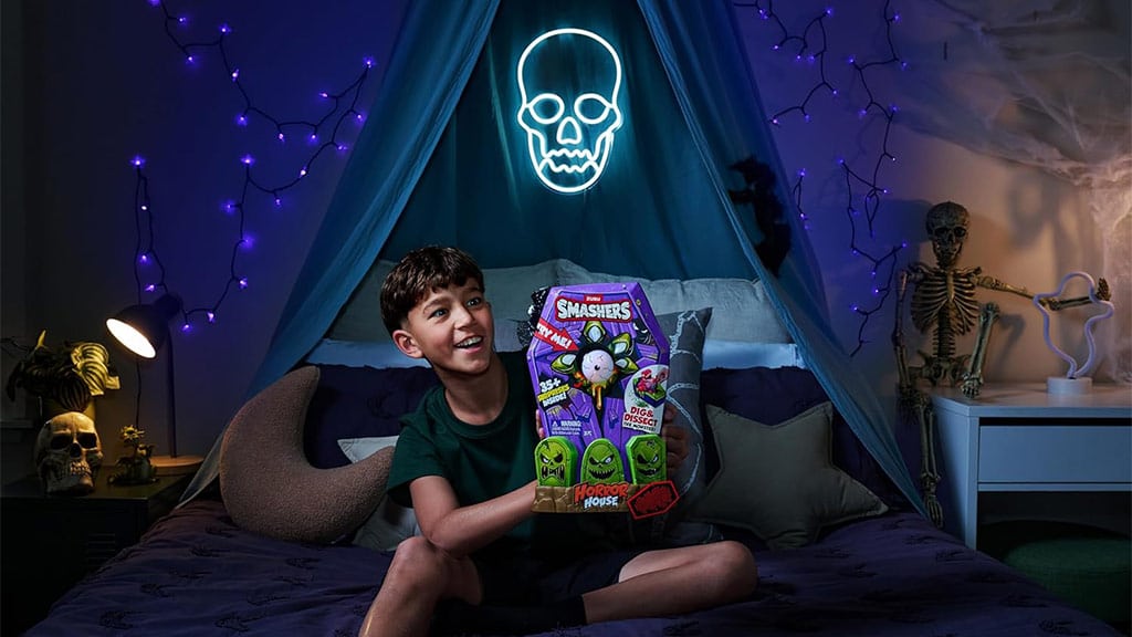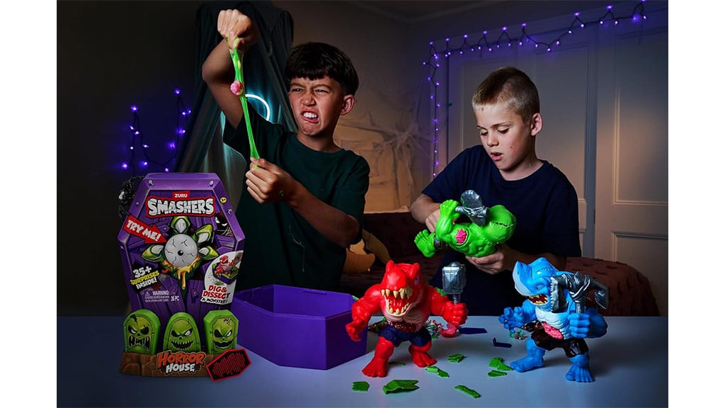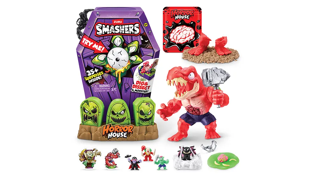 Navrženo pro děti od 3 let, Smashers Mega Horror House od ZURU je zážitkem z rozbalování, který nabývá děsivých rozměrů. Děti rozbalují překvapení, prohledávají sliz a písek a otevírají rakve, aby objevily více než 35 překvapení, včetně mini figurek, samolepek a mnoha dalších. Největší výhrou v balení je Smasher Monster! Mohou být sesbíráni tři Smasher Monstra: Zombie Rex, Blood Shark a Brain Dead. Jakmile děti sestaví všechny části Smasher Monstra, musí vložit mozek monstra a ponořit se do jeho nitra, aby našly poslední překvapení, které na ně čeká.