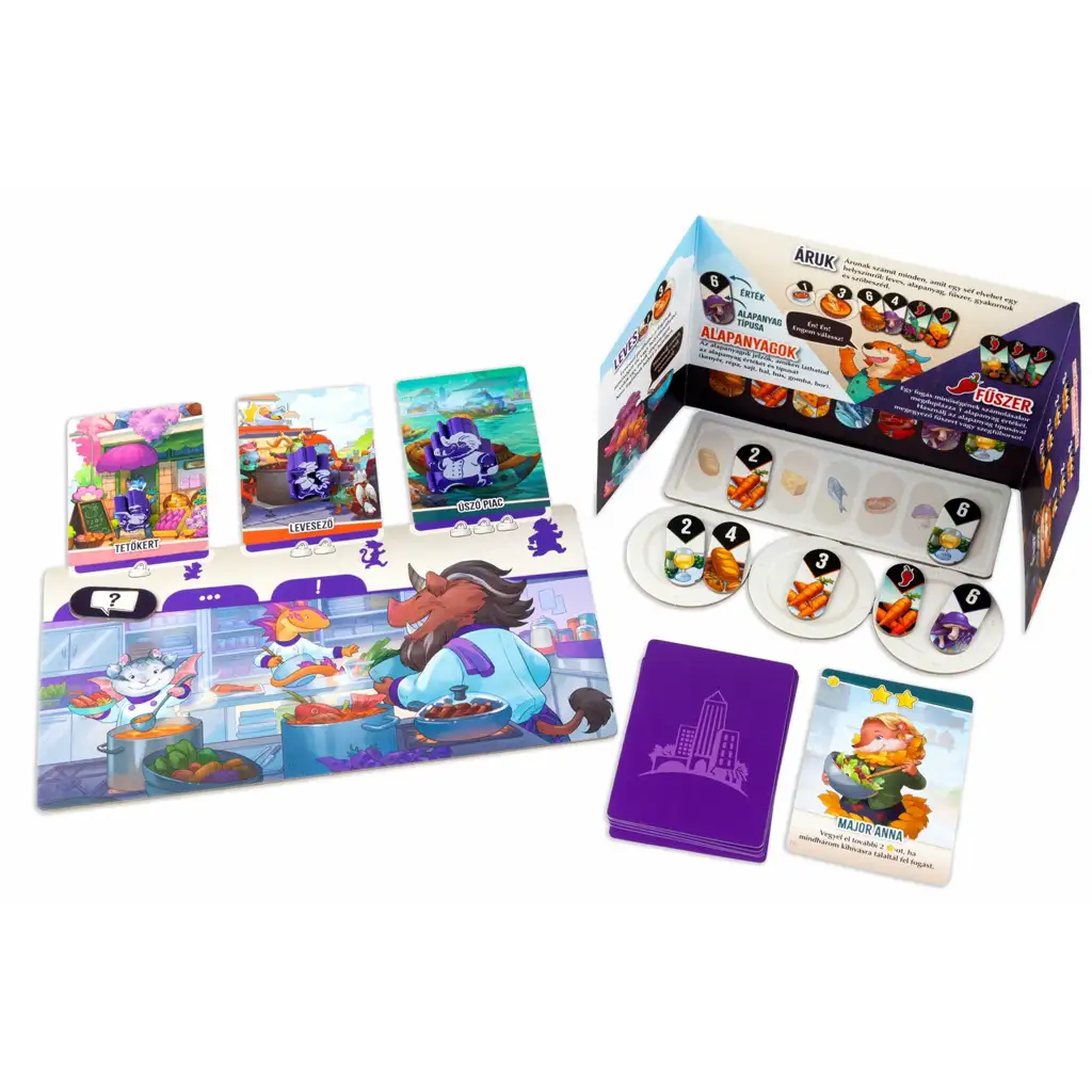 Představ si, že ve čtvrti plné rušných restaurací v malém městečku provozuješ vlastní bistro – a to ne ledajakým způsobem! Ve stolní hře „Zvířecí pochoutky“ se ty a tvá rodina můžete vžít do rolí jedinečných zvířecích šéfkuchařů, abyste bojovali o ty nejlepší pokrmy, nejchutnější suroviny a přízeň kritiků. Čeká vás napínavá, taktická hra, kde na každém rozhodnutí záleží a každý tah přináší nové výzvy!