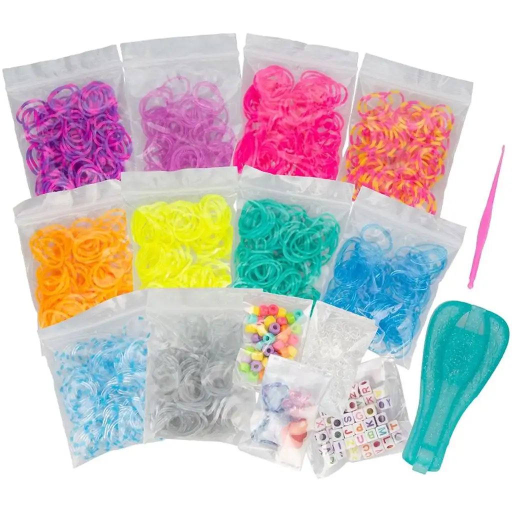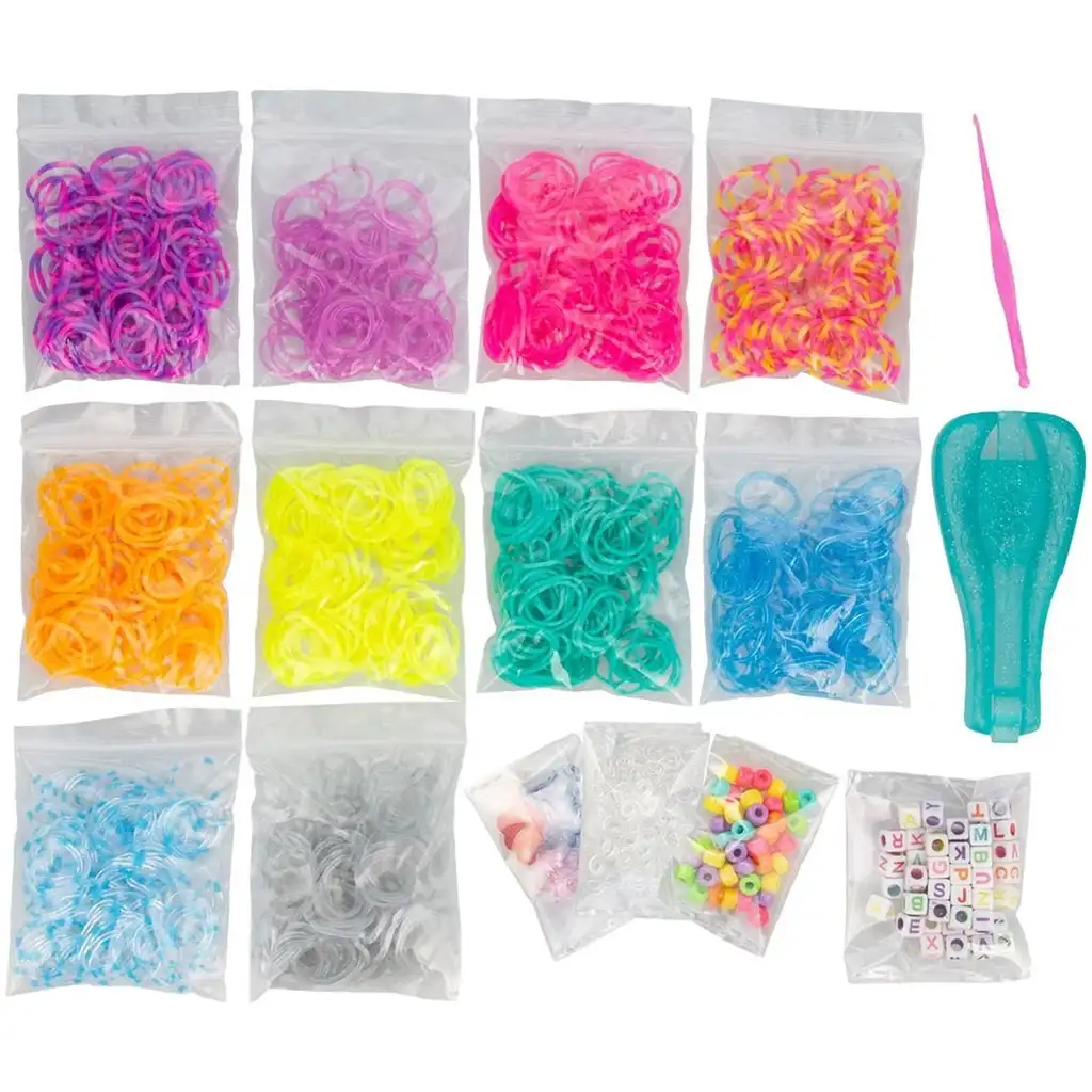 Balení obsahuje 1000 různobarevných gumiček, díky nimž je téměř nekonečná možnost kombinací vzorů a barev. Díky přiloženým korálkům s písmeny abecedy a barevným korálkům lze do náramků navlékat jména nebo vzkazy, což z nich činí ještě osobnější dárky. Sada dále obsahuje praktický háček a nový, třpytivý nástroj na výrobu náramků EZ Loom, který tvoření usnadňuje i zrychluje.